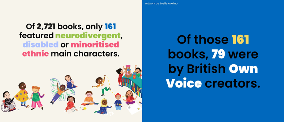 - Of the 2,721 titles surveyed, just 5.9% had a neurodivergent, disabled or minoritised ethnic main character, and fewer than half of those were written by British Own Voice creators.