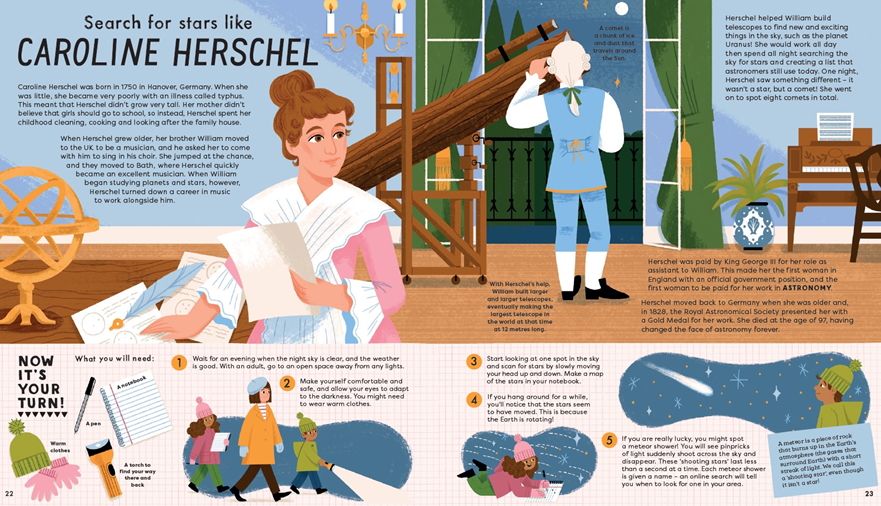 I like a lot of the scientists in the book and all of the women, obviously. I like Caroline Herchel, she's a personal role model, but also Mae Jemison and Tapputi-Belatekallim as well. Pretty much all of them stand out for different reasons, but definitely the women more than the men. That's just because they are role models and inspiration for me - and I know that they might have had to work a little bit harder to get to where they got to.