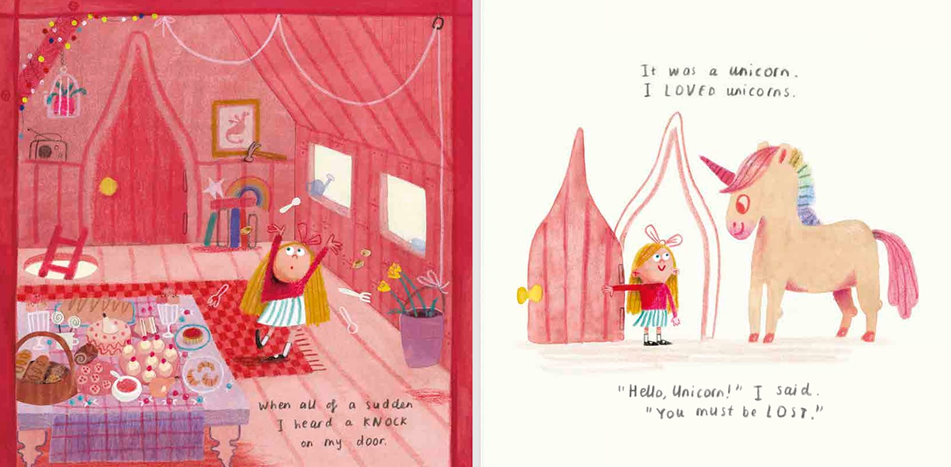 In this book we find a little girl having a wonderful imaginary tea party in her rainbow filled treehouse. Just when she thinks things couldn't get any more wonderful - there is a tap at her tree house door. And lo and behold - It's a unicorn!