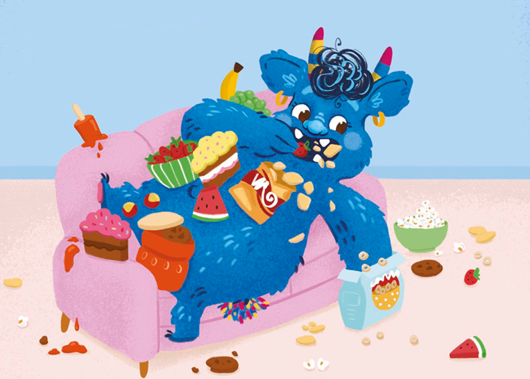 When mummy monster eats all their favourite snacks! My two always bickered over what things belonged to whom. Who gets the purple plate, who had more grapes, and which snacks belonged to whom. Strawberries, grapes didn't last five minutes in our house and I was lucky if I got any! So I love that Mummy monster gets to indulge and spoil herself. Plus, it was so much fun to draw!