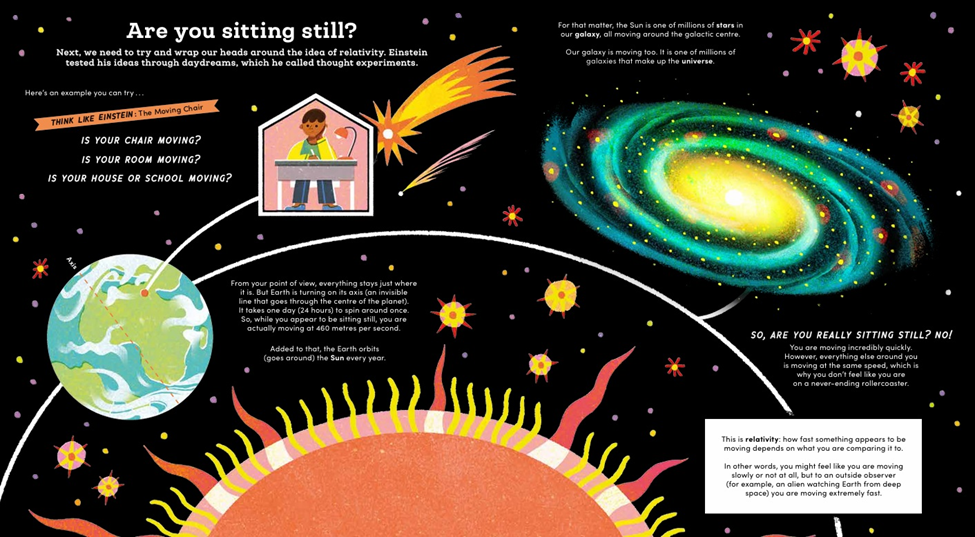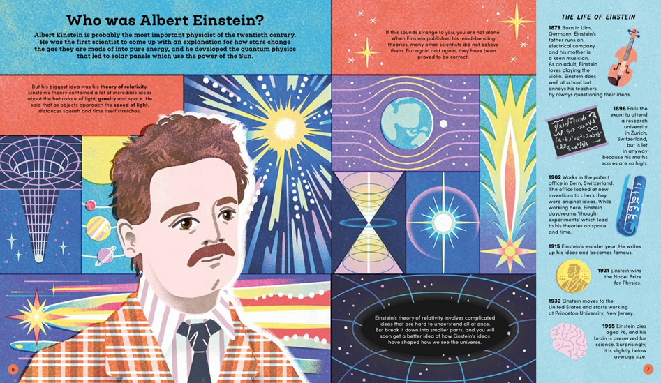 I was lucky because as a Physics teacher, I had learned some of the subject to teach at school so I had a basic idea of some of the ideas involved. I came up with the idea of how the science should follow on from page to page. I read a lot about Einstein and his ideas, wrote the page spreads then cut lots of the information down to leave just the most important bits.