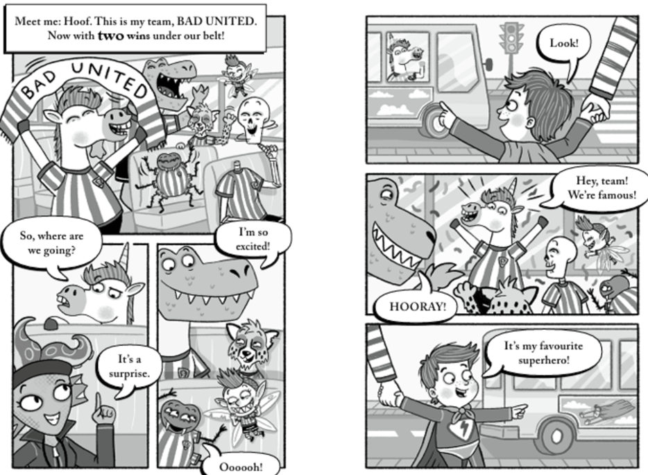 Fast as Lightening is the latest instalment in the Bad United Series. Louise Forshaw continues the series with this brilliantly written graphic novel. The page designs with different layouts and illustration sizes add interest and the limited language and well chosen words allow the younger reader to use the combination of text and image to become immersed in the story. Chapters are clearly themed and the perfect length to allow for clear times for a reader to take a break, if they can put it down.