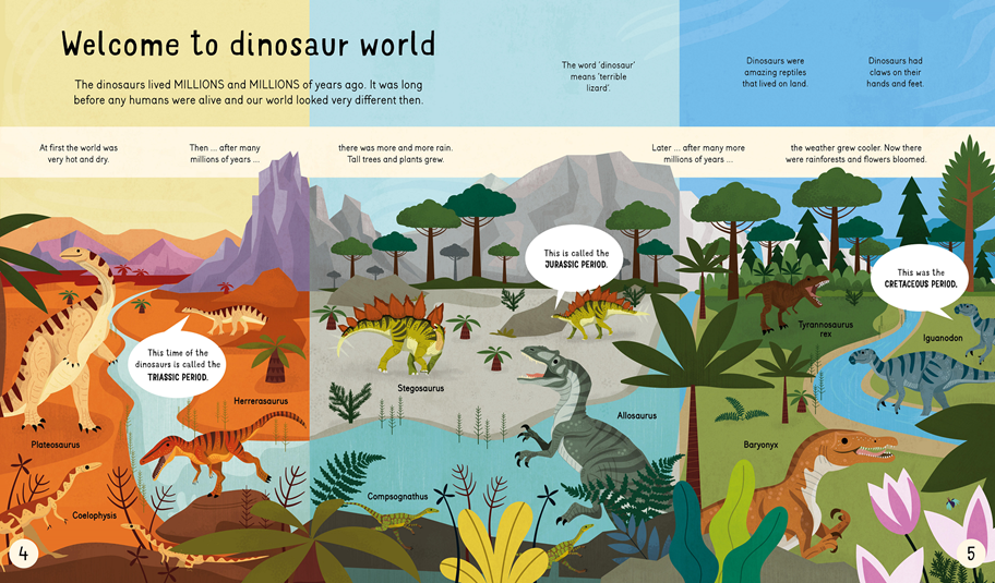 Starting with an explanation of what dinosaurs were and when they lived, the book defines the different periods clearly before moving on to answering questions about their size and diet before honing in on specific dinosaurs like Tyrannosaurus Rex and Deinonychus. Dinosaurs which lived in the sea and those which flew are also covered. The book explains how fossils developed and how palaeontologists work like detectives to learn more about these fascinating creatures. The book concludes with theories about how the dinosaurs died out and a glossary of 'special dinosaur words'.