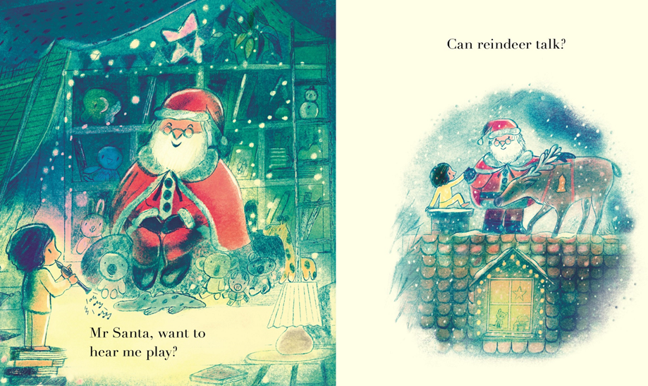 Mr Santa, want to hear me play? Do the reindeer talk? And can I ride your sleigh?