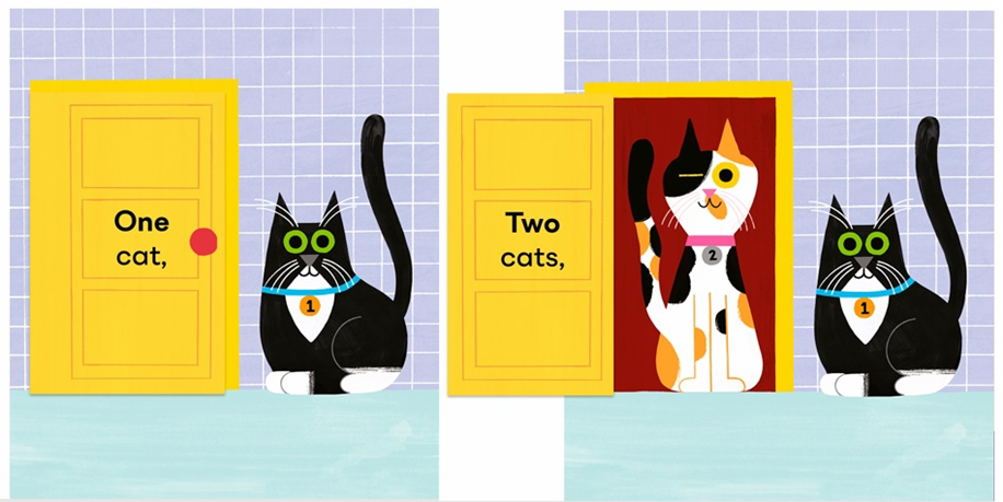 One Cat, Two Cats teaches SO many important number elements, too. At first, we learn to recognise numerals as each cat we are introduced to has a number clearly presented on its collar. We are then able to begin supporting children to learn the word spelling for each numeral, as they match this to the hidden cat behind each flap.