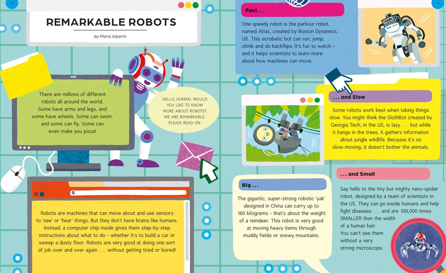 Spinning 'Explore' could lead readers to information about wild homes, explain why Christmas Island turns red every year between October and December, or take you on holiday somewhere in the universe. Landing on orange will give you a giggle as you find out how to tell a joke or discover the colour of a brown bear's poo. Blue is the colour of the 'ooh' category, full of surprising stories about remarkable robots or some mysteries from the past, whilst yellow will make you wonder at kangaroos or the brilliance of butterflies.
