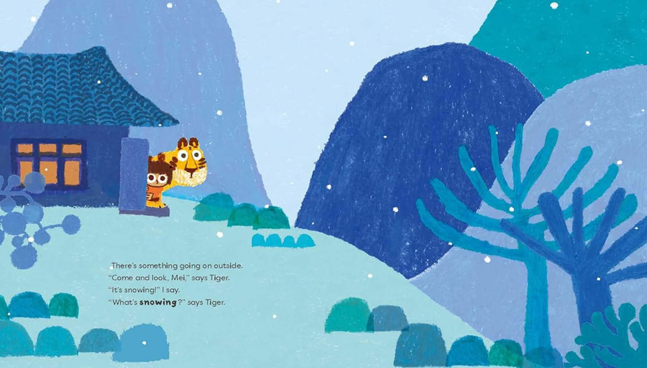 Little Mei and her friend, Tiger, are excited because it is snowing. Tiger has never seen snow before and is so keen to explore that he doesn't notice how cold Mei is getting. When he does, they both head home for a warming bowl of soup and bed.