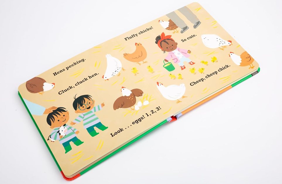 Let's go down to the Muddy Farm! with four toddlers and their families and spend the day with the animals. Arrive at the farm ("so exciting!"), see the animals ("fluffy chicks"), have a snack ("crunchy apple"), then take a ride on a tractor ("so bumpy!").