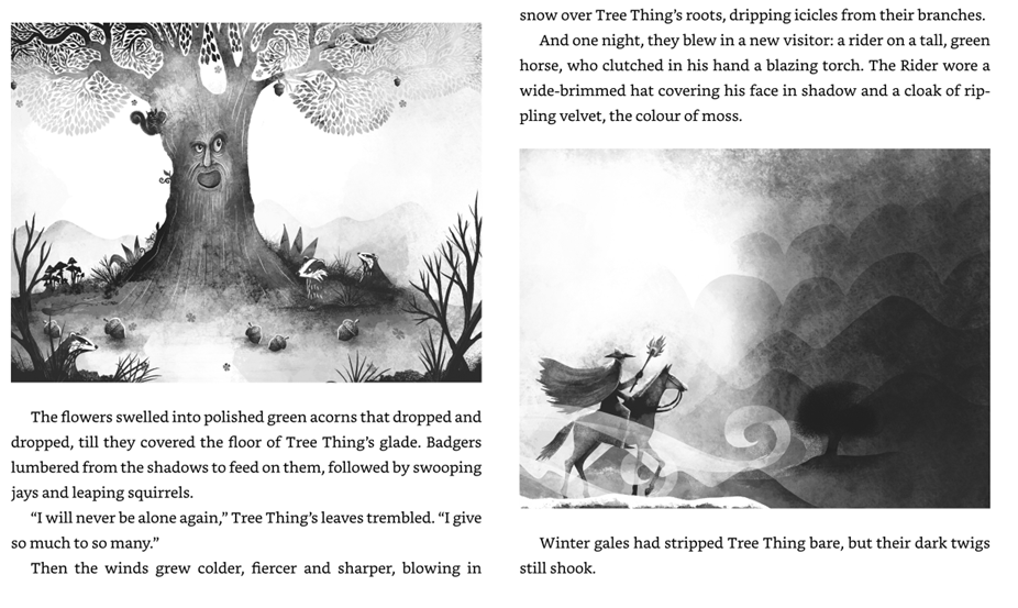 When a green thing grows out of the ground - 'for that is how the story always begins' - it brings with it life and change. But the Tree Thing is destroyed when the shadowy Rider leads a bunch of people to chop it down - 'same old story'. But wait! A jay and a squirrel bring its glowing emerald acorn to a valley where nothing grows. Marlo and his family are barely surviving here until Tree Thing sprouts again, bringing life and hope to the whole village. For a while, all is good. Then - 'same old story' - the shadowy Rider arrives with an axe . . . Will Marlo be brave enough to stand between triumph and disaster?