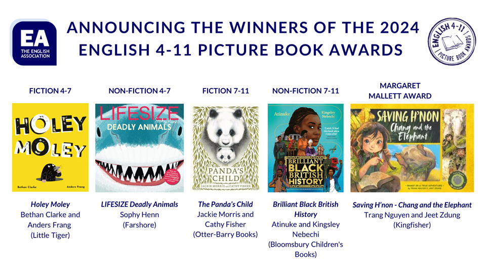 The winners of the 2024 English 4-11 Picture Book Awards have been announced. The awards are presented by the English Association to the best children's picture books of the year and include awards for fiction and non-fiction in age ranges 4-7 years and 7-11 years. There is also an award for a non-fiction text, the Margaret Mallett Award for Children's Non-Fiction.
