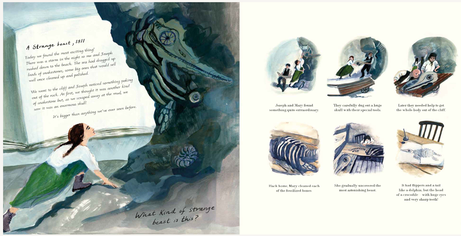 "I wanted the reader to hear Mary's voice and see her ideas and imagination, so they could understand her motivation and the passion she had for the work she did. The illustrations were integral to that, moving between factual spaces of the 19th century to imagined prehistoric scenes."