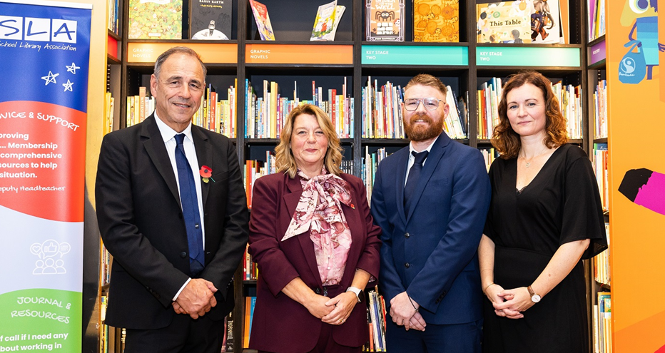 Julie Broadbent (centre left) received her award from Antony Horowitz (left), with Garry Barber (Browns Books) and Victoria Dilly (SLA)